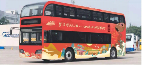 仪式在大禹陵举行,描绘大禹陵的巴士格外令人瞩目,车身涂装选取了大禹铜像、享殿、大禹陵碑等景区标志性建筑进行艺术化加工,并在车尾以水元素作为点缀,烘托出大禹治水英雄的伟大形象。整体外观设计简约流畅,色调明丽,时尚大方,又不失古典韵味。