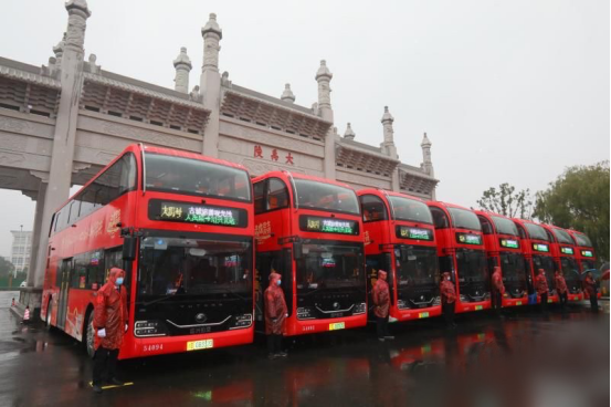 现场,8辆“大禹号”双层巴士在大禹陵景区大入口棂星门前一字排开,一抹醒目的红色在雨中格外夺目耀眼。8辆车的涂装各具特色,分别以大禹陵、鲁迅故里、东湖、古纤道、绍兴古镇、沈园、兰亭、阳明故里八大绍兴著名景点为主题,以8幅各具特色的古城绍兴画卷,打造出“一车一景”的流动景观。