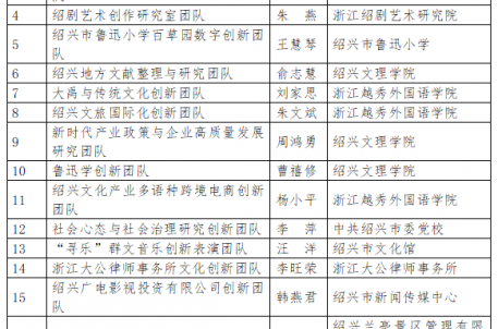 根据《中共绍兴市委关于加快建设新时代“名士之乡”人才高地,全力打造高水平创新型城市的决定》和《绍兴市重点创新团队建设管理办法》精神,以及今年全市人才工作总体安排,市委人才办、市委宣传部组织开展了第五批重点文化创新团队考核评选工作,经专家评审,兰亭景区的文化产业化研究创新团队以景区主任汤晓蕾主任为带头人,被评选为绍兴市第五批重点文化创新团队。