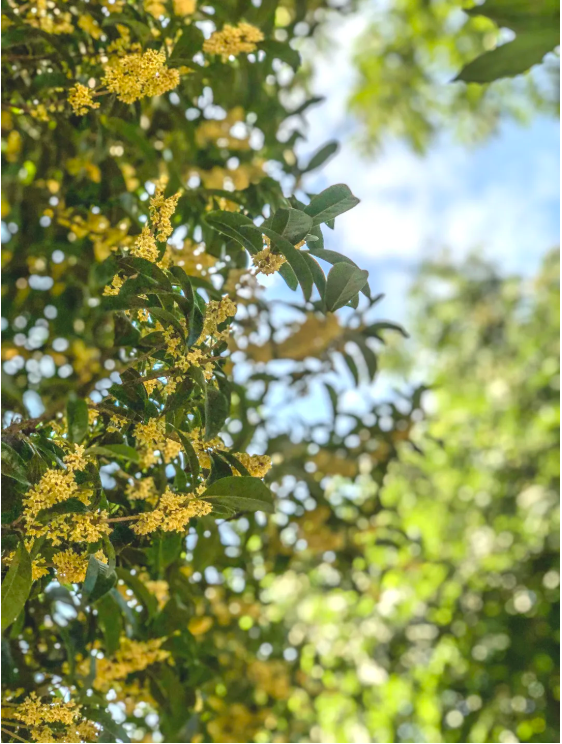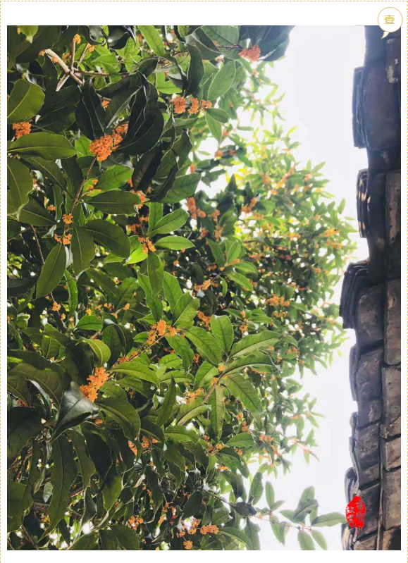 就着浅浅日光,一阵阵沁人心脾的芬芳在老街蔓延,屋檐下的那一株株桂花树为老街的黑墙白瓦增添了新的色彩。