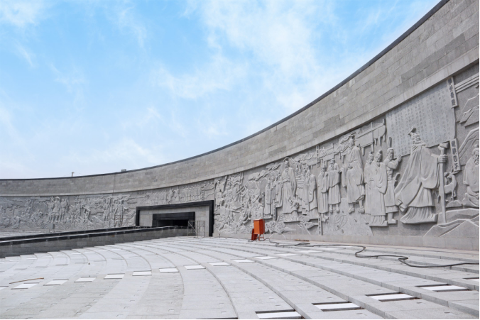 祭禹广场已建设一新,水上祭坛、钟亭、鼓亭、洛书台、图腾柱,气势壮阔。 广场后的巨幅浮雕墙上绘刻了大禹的人生经历与伟大业绩。左侧为治水主题,叙述禹生石纽、受命治水、地平天成等九部分内容;右侧为立国主题,记录大禹平定三苗、划分九州、铸造九鼎、归葬会稽等九部分事迹。整幅浮雕如叙事长卷,令人震撼,展现了越地源远流长的禹文化脉络,传递华夏先祖的不朽精神。浮雕墙下,排列着13个方阵,可容纳1万人参与公祭典礼。