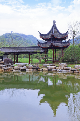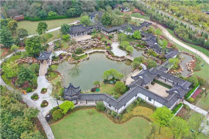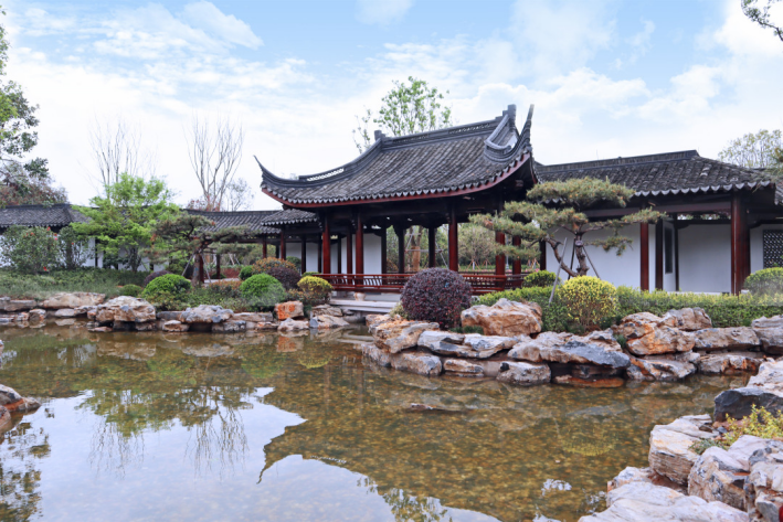 古朴亭台的飞檐墨瓦,被春雨浸润得锃亮