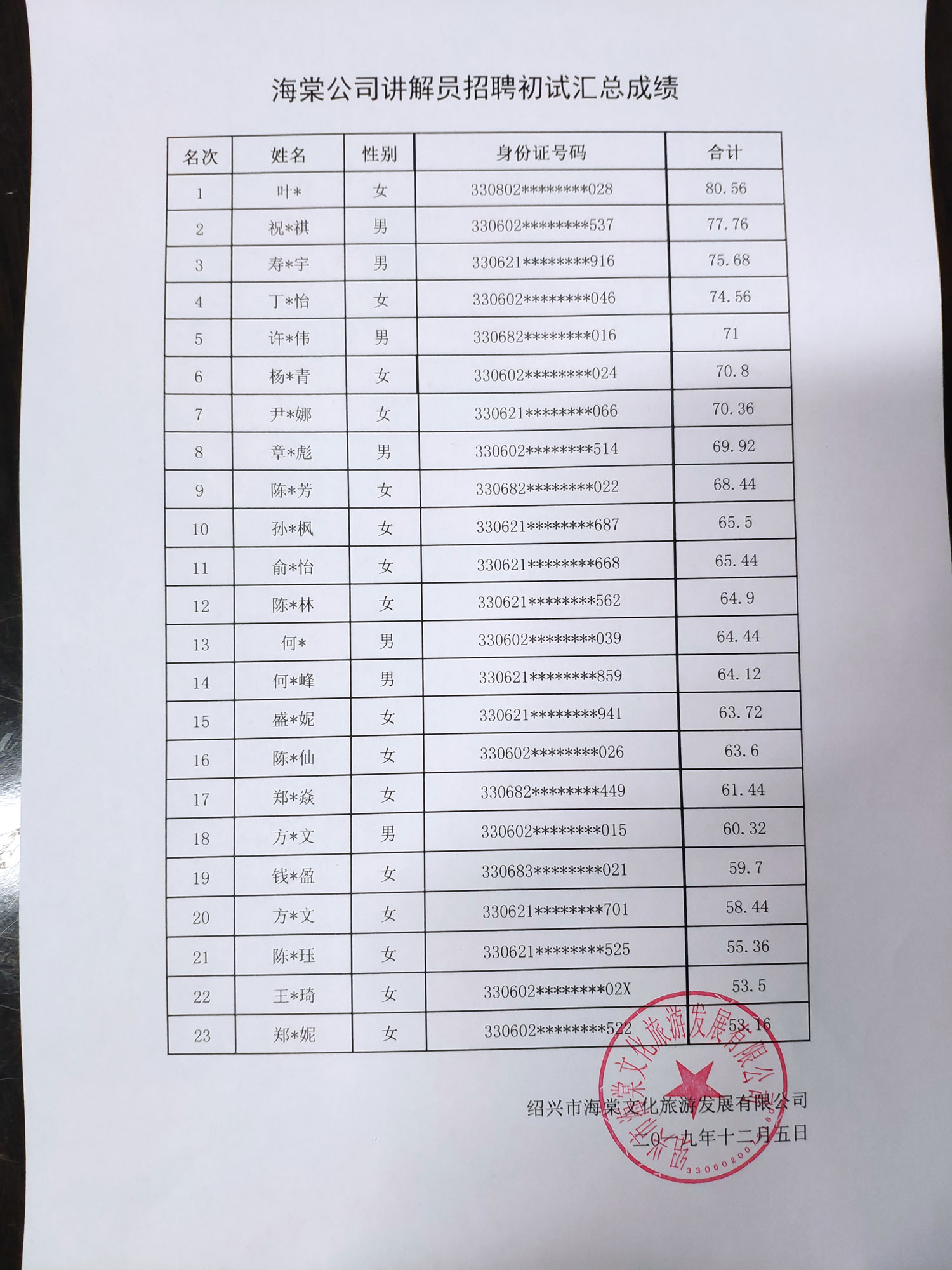 根据讲解员初试情况,经研究决定,初试总成绩前12名人员入围复试,复试时间、地点另行通知。