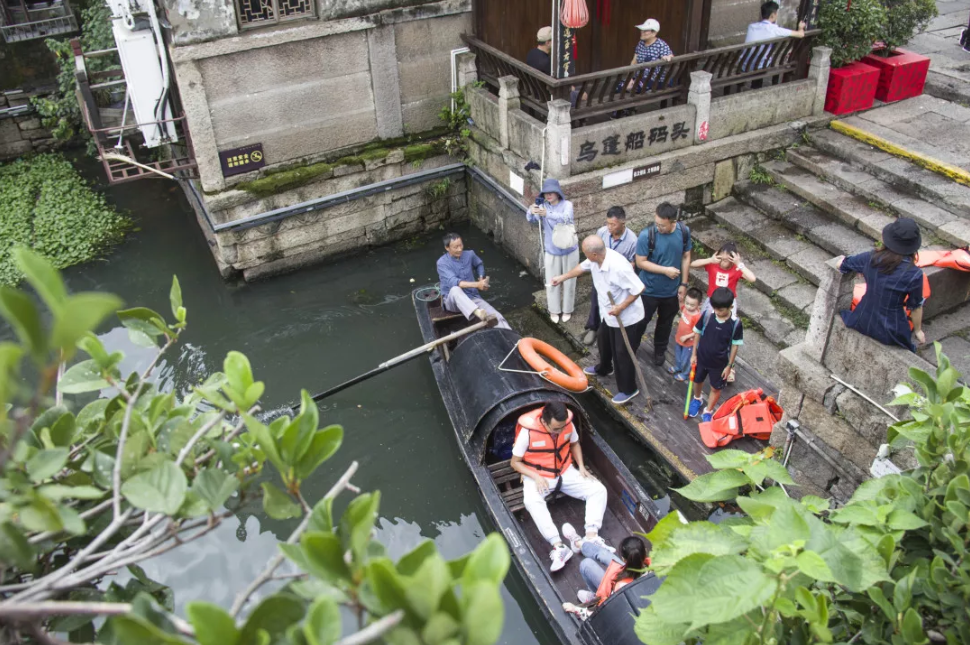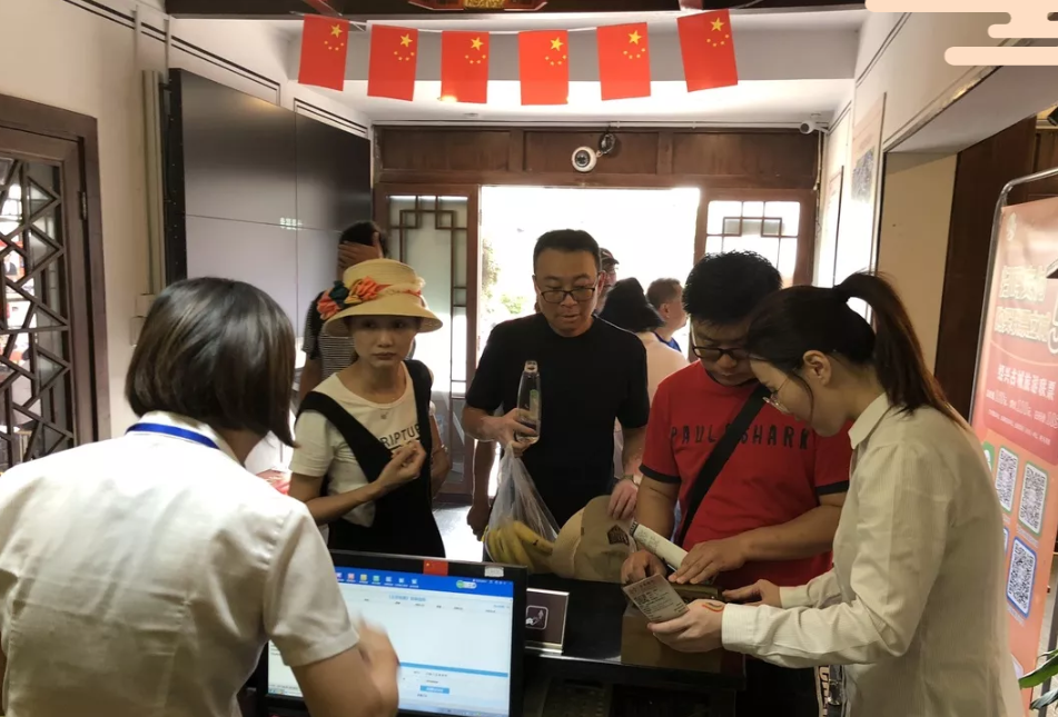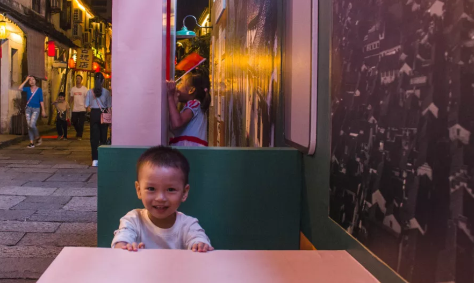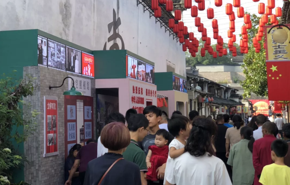 为了庆祝新中国成立70周年,景区在蕺山街两侧升挂国旗,在街区中设立影像中国,以新中国成立后时间线为主轴,以胶卷播放模式展现新中国发展历程,让市民及游客们用照片来留下美好的回忆。