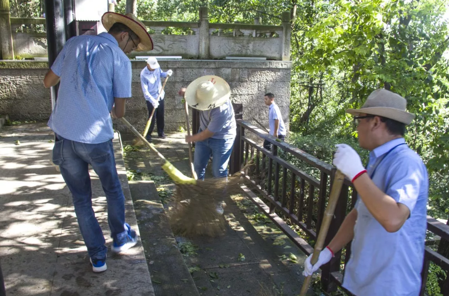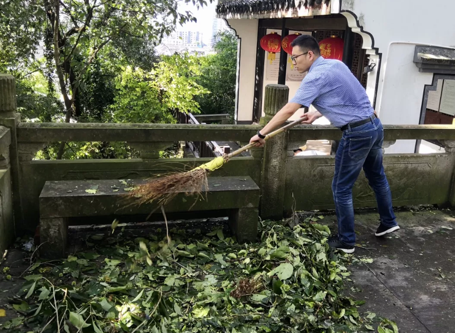 台风过后,书圣故里景区党支部书记、董事长龚凌带领全体员工对景区开展清理工作,对景区内的落叶、垃圾进行彻底清扫,确保道路干净整洁,为游客创造一个良好的旅游环境。