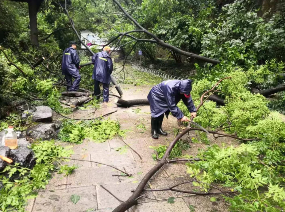 蕺山书院多处地方出现折树和落叶遍地的情况,景区工作人员迅速展开善后清理工作。景区工作人员迅速清理被台风刮落的树枝和落叶,疏通道路,消除潜在安全隐患。