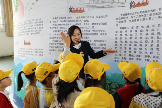 大禹文化进校园第二站——陶堰镇中心小学。大禹在哪出生,又沿着什么线路治水?他是如何建立中华第一个王朝——夏朝,最后又归葬于何处?面对同学们的诸多提问,大禹陵景区讲解员配合展板文字,按照逻辑脉络,详细而又深入地介绍相关历史知识。