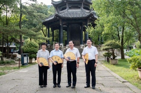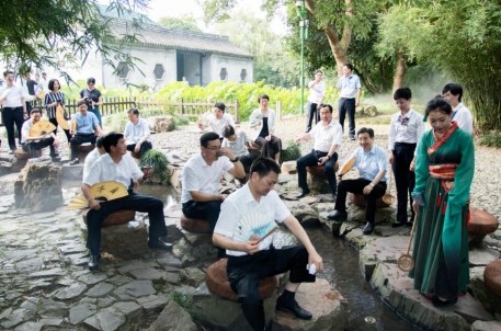 在兰亭景区,周书记一行参观了鹅池、兰亭碑亭等著名景点,并在曲水流觞处体验仿古的兰亭雅集活动,虽骄阳似火,却无法抵挡来宾们参与活动的兴致。在“兰亭的故事”文创专区,兰亭景区主任汤晓蕾向周书记一行介绍了文旅融合大背景下,兰亭景区自主设计开发的文创产品,“竹”系列、“兰”系列、“白鹅”系列等七大类千余种产品,独具匠心又意趣萌动,深受来宾们注目。