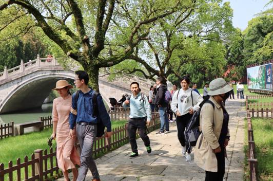 上午,已有不少游客步行进入禹陵,到古老的会稽山下踏青、赏春。