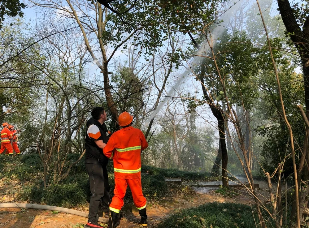 对周围树木进行浇湿,从火源边缘向中心点灭火,防止火情蔓延,最大限度的减少火灾损失。