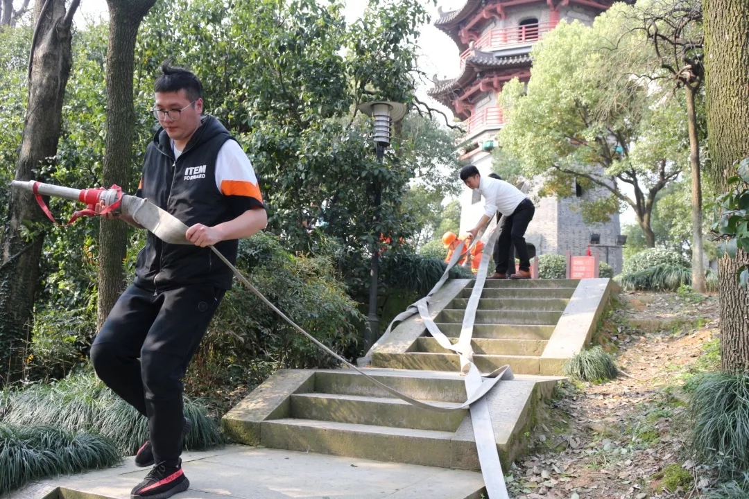 灭火组成员分别赶到文笔塔附近消防栓的各个位置上,打开消防栓盖,连接好水带枪头迅速奔赴火灾现场。