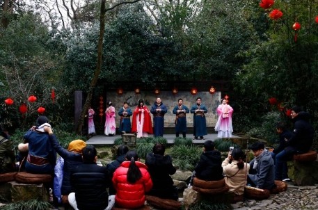 每年正月初一的晋圣仪式因寓意吉祥,仪式古典,一直受到许多书法爱好者、书法家及游客的喜爱。近年来,随着国学书法文化的有力推动和一些影视剧作品中关于古典礼仪、仪式的宣传,更多的游客对传统礼仪文化有了进一步了解的期望,对此,景区也重新编排了晋圣流程,使得整场晋圣活动更富有仪式感、可参与性和视觉美感。上午十点,绍兴市委宣传部副部长、市文化广电旅游局局长、市文联党组书记何俊杰,书会会长王建华,书会副会长、秘书长倪七一,兰亭书会会员及来自绍兴文旅界、书法界、收藏界等的人士,以及景区领导们共同参与了本场活动。接下来,书法名家在景区内现场书艺展示,为来兰亭过年的游客朋友们书写新春对联和“福”字,所有作品均以才艺置物的方式馈赠给游客,受到了一致好评,也直接拉动了曲水流觞的参与热度。今年春节,景区为大家准备了十年陈香的绍兴老酒,新春特色糕点让游客朋友坐拥兰亭山水,欣赏古典舞曲,学习古代礼仪、品老酒,吃糕点,吟诵诗词,全方位体验新春特别版曲水流觞盛宴!该活动参与性高,互动性强,是最人气的景区活动。