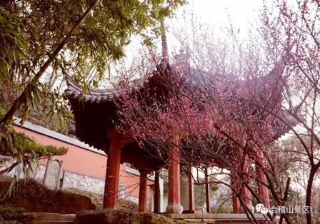这株红梅树龄已近50年,近春时节,绽放得更为茂密,鲜艳欲滴,袅袅娜娜,别有一番韵味。红梅所扎根的小丘,年岁则更为悠久,静默地承载着千百年来的稽山历史。