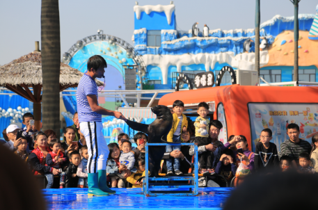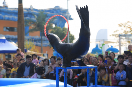 在10月底的某一个周末,在闭园已久的绍兴梦幻水世界迎来了一位新朋友。这个新朋友黑黑圆圆,却也迅猛灵活。原来是1岁多的海狮小朋友来表演了,受到了非常多绍兴小朋友们的热烈欢迎。它随着饲养员的口令,一会儿头上顶球,一会儿转呼啦圈,一会儿原地打滚,一会儿又嗖的一下钻进了水里,沾湿了身体,再晃上岸。随着一个个精彩的动作逐一展示,人群中也爆发阵阵热烈的掌声。回头再看这位新朋友,竟然站在舞台上自己挥舞拍打着巴掌呢。