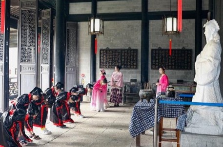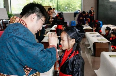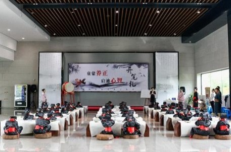 9月10日上午,在兰亭书法博物馆,50名一年级新生身着汉服,在悠扬的编钟古乐声中,迎来了他们求学生涯中第一场盛大的开笔礼仪式。整场开笔礼分为正衣冠、净手静心、朱砂启智、击鼓鸣志、启蒙立人、诵读经典、师长寄语、敬香朝圣和曲水流觞共9项流程。