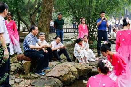 九月,正值开学季。景区内刚好有百余位学生在参加开学礼。描红、拓碑、曲水流觞、活字印刷、开笔礼等活动,内容丰富,现场氛围有序良好。部长充分肯定了景区这一“文化+旅游”高度融合的举措,并和同学们亲切交谈,关心关怀同学们的学习、生活。在文创展区,兰亭景区主任汤晓蕾向部长介绍了“兰亭的故事”自营品牌的一系列情况。近千款文创产品,都抒写着和兰亭有关的故事,品牌特色十分凸显。而刚刚喜获2018中国特色旅游商品大赛银奖的“桥缘”提梁壶茶具和结合绍兴地方元素,设计开发的多功能服装,更是受到部长盛赞。部长指出,旅游业作为幸福导向、健康导向、文明导向的产业,要不断适应市场发展新需求,以全域旅游为主要载体,加快推进旅游供给侧结构性改革,发挥旅游产业的综合性、带动性、支柱性和全民性功能,以完善产业配套要素,提升整体服务和管理水平,促进供需协调平衡,形成旅游产业发展新格局。