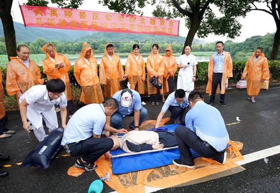 人员抢救。医疗救护组到达事发现场对落水者进行抢救,将其抬到阴凉处,用人工呼吸、心脏按压等手段进行抢救,同时等待120急救车的到来。后勤保障组警戒现场,安抚游客情绪。