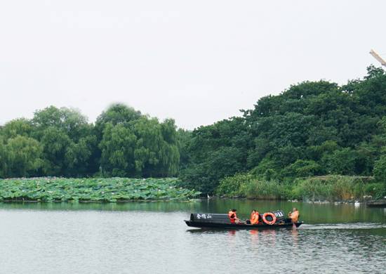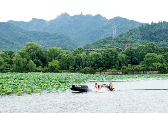 随后,水上救生演练展开。一条载有一对情侣的乌篷船向荷花池划去。
