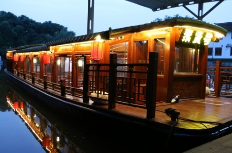 “聚贤号”和“会稽号”是水城公司全新打造的两艘富有浓郁水乡特色的豪华画舫。这两艘新船外型、内部构造和机器配置一模一样,金色铝瓦装饰的船顶,木包钢技术,拥有靓丽的菠萝格红木材质“外型”和坚硬的钢制“内脏”。船舱内部配套设施齐备,红木桌椅,液晶电视、卡拉OK点歌器一应俱全,还设有独立卫生间和开水间,适用于各类政务接待、商务活动和私人定制服务,相当美观大气。