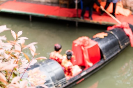 新人上船后,在证婚人的引导下,两人在乌篷船上演绎挑盖头、拜堂、喝交杯酒等传统婚俗,全场的气氛一度达到了高潮。随后,水上婚礼的船队浩浩荡荡向着沈园开始水上幸福大巡游,一路接受市民和游人们的祝福。