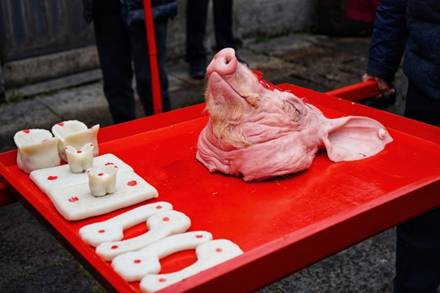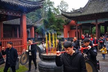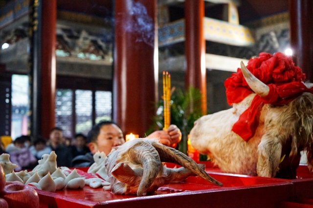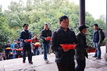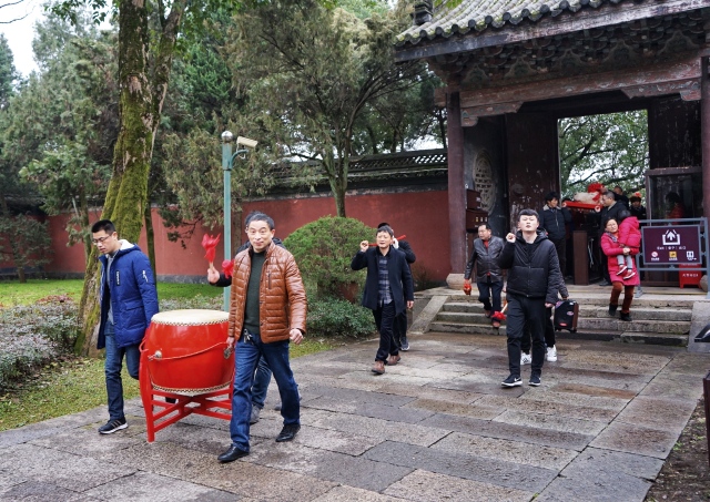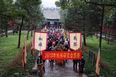 上午九时十八分,百余名大禹后裔从守陵村出发,扛着朱红托架,上置三牲(牛头、羊头、猪头)福礼、三茶六酒、春粮、水果、花篮,手举姒族祭禹旗帜,敲锣打鼓浩浩荡荡前往禹庙大殿祭祀先祖。