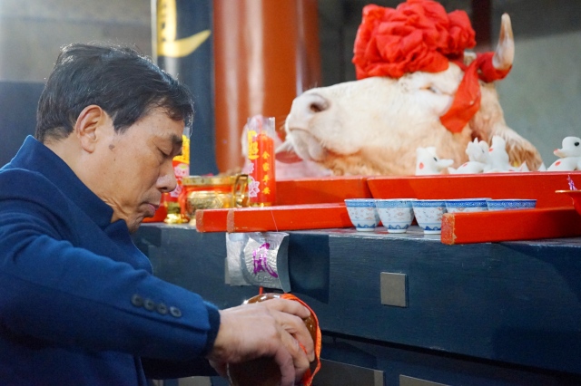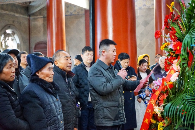 绍兴市姒族研究会会长、大禹第143代孙姒茂利诵读祭文,后裔族人代表先后向大禹像鞠躬、敬香,代表全体大禹后裔向祖先行礼,以祈求来年风调雨顺,五谷丰登。