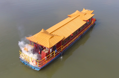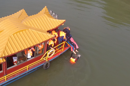 上午9:30演习正式开始。我公司水乡号游船,载着20名游客,行驶至快阁鉴湖水域时,突然船尾失火,冒出滚滚浓烟,船员发现失火情况后,立即启动失火自救应急机制,在疏散游客过程中,有一名游客不慎落水。接到船员求救信号后,我们立即启动应急预案,组织现场船员及救援船,立即扑灭船上明火,并迅速救起落水者,对落水者进行了心肺复苏,还将其送往医院。同时还组织应急客船,转移现场滞留游客,并载着游客继续古鉴湖水上之旅。