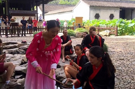 2002年,“塔夫茨在中国”项目开始运行。每年秋季,美国塔夫茨大学都会派出喜欢中国文化的学生到绍兴进行为期数日的游学旅行,绍兴兰亭是他们每次游学的其中一站。在这里,他们认真聆听书法家喻革良讲述《有趣的汉字与奇妙的书法》,讲汉字的起源及演变过程,讲“天下第一行书”《兰亭集序》的故事,同学们还握笔感受了书写的乐趣。在曲水流觞景点,同学们穿着中国汉服载歌载舞,并用简单的中文学着作诗,演绎千百年前的文人雅事。