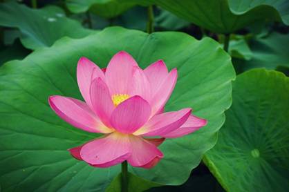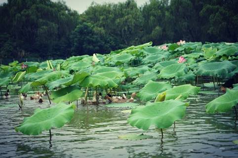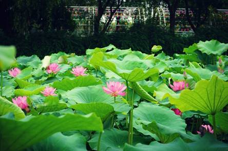 放眼望去,密密麻麻的荷叶铺在水面上,绿意盎然。有的含苞待放,有的张开了三四片花瓣,有的全部盛开了,如一位位亭亭玉立的少女。
