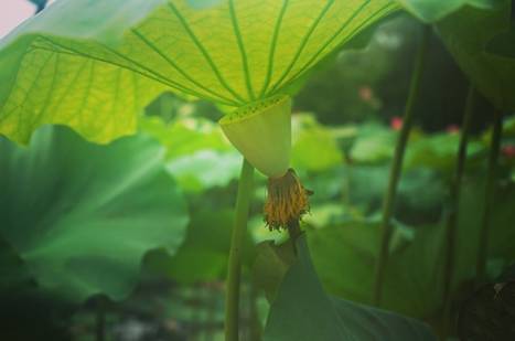 几处荷花凋谢之后变成了清新的莲蓬。