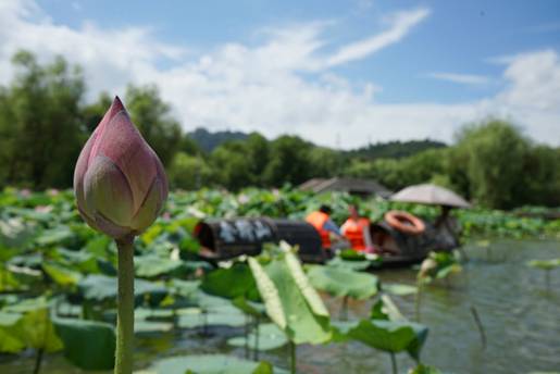 乘着会稽乌篷,翠绿的莲叶随着微风涌动,将丝丝暑气消散,令人身心舒畅。淡淡的荷花清香,仿佛一切的浮躁与不安在这一刻都被沉淀。