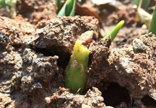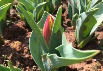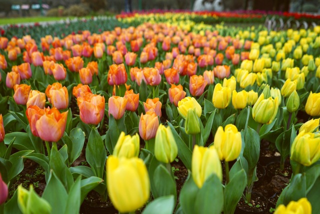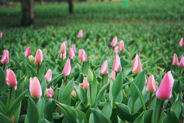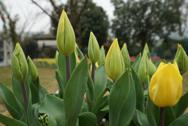 目前花田里早期的郁金香,在春日暖阳的照耀下都有了芬芳前的雏形,含苞待放。