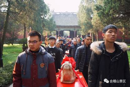 早上9时18分,在锣鼓声中,百余人着正装,抬着牛、羊、猪头,五谷杂粮,水果等祭品,从守陵村出发,手举姒族祭禹旗帜,浩浩荡荡前往大禹陵禹庙大殿祭祀。