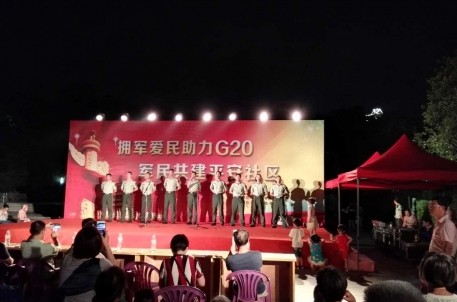 为了迎接第89个八一建军节以及迎接G20峰会,进一步巩固和发展军民关系,由我市府山街道办事处和市消防中队主办的“拥军爱民助力G20军民共建平安社区”晚会在越王城广场开办。参加表演的有市消防中队的消防人员和街道的居民,他们通过唱歌和舞蹈的形式开展了一系列内容丰富的双拥活动,加深了军民之间的了解和沟通。