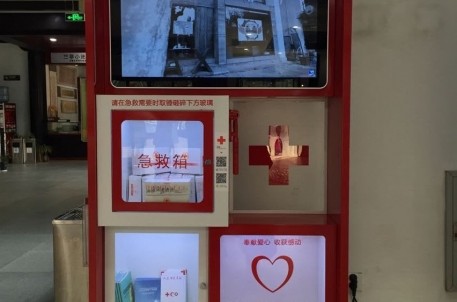 这个集宣传募捐为一体的”红十字募捐箱”,以红白相间为底色(与红十字会LOGO颜色相相袭),摆放于景区游客中心醒目位置,可有效地将其实用功能发挥极致。募捐箱主要有视频宣传、募捐箱、宣传箱(用于摆放红十字会宣传资料)、急救包、急救毯和急救箱组成。急救箱内配置了人流密集场所常用的急救物品,如卡扣式止血带、绷带、纱布、急救毯、创可贴等物品。游客若在景区(饭店)不慎擦伤流血或出现其他突发状况,可有效地初步救护,为下一步救治赢得宝贵时间。