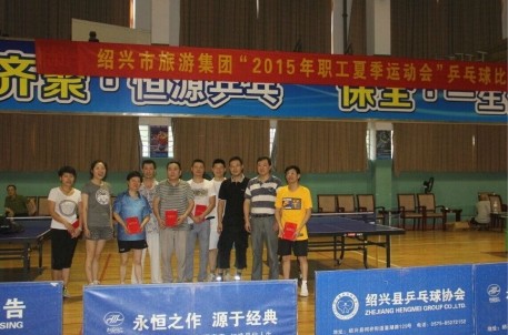 由绍兴市名城办承办的绍兴市旅游集团有限公司“2015年夏季运动会”乒乓球比赛于7月26日在文澜中学乒乓球馆举行。来自11个基层工会37名男女选手报名参加比赛。经过小组循环赛和淘汰赛两轮的激烈争夺,最终获得男女前六名选手是如下: 男子组:郭永社(兰亭)、石坚(机关)、裘裕新(名城办)、朱钢强(东湖)、王华(绍兴饭店)、江洪杰(机关); 女子组:孟云英(名城办)、陶迪娟(名城办)、徐宏(机关)、杨春(鲁迅•沈园)、钱红云(水城)、翟欣欣(旅投)。