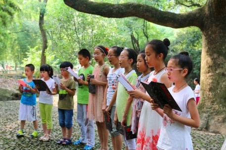 结束了上午的活动,景区又在下午2点推出了“学唱《兰亭集序》,品味文学经典”活动,此项学唱活动参与者为“我爱经典”诵读会的成员及自发报名参加的家长和孩子们。大家结伴围坐在鹅池旁大樟树下,用独特的曲调,抒发了王羲之当年举行这场盛宴时,和宾客们一起把酒言欢,畅怀宇宙的美好心情。