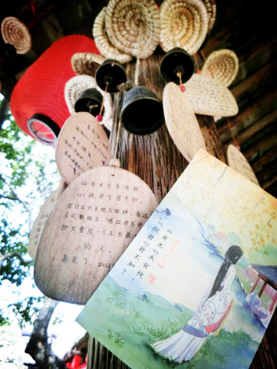 游客们可将爱的宣言和心灵寄语填写在漂亮的风铃上,悬挂在爱情驿站及长廊上,着伴随阵阵铃声,引发诸人缕缕情丝。赠送沈园特色的精美贺卡,游客可填写送给亲友。