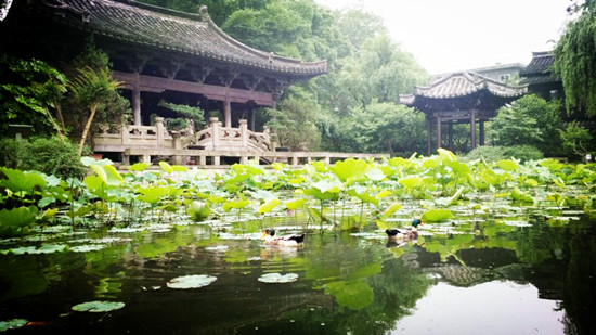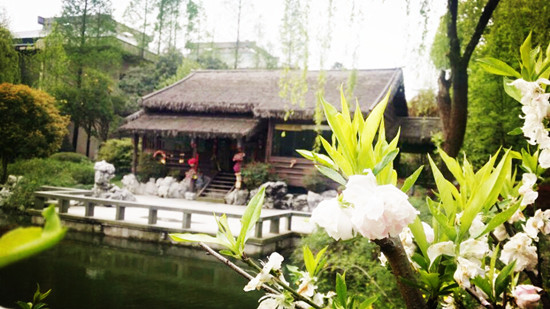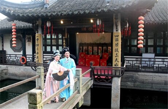 沈家园内,绿树掩映,幽静避世,游客可以坐于宋式院落双桂堂中,一边品茗,一边欣赏越剧爱情名段,陶醉在沈园美景中。