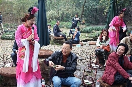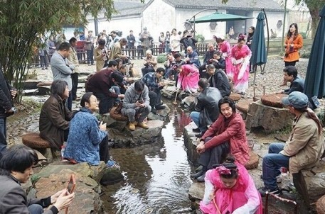 次日,全体与会人员前往徐渭墓和兰亭景区参观。在兰亭景区,画家老师们深情感受书法圣地幽情,重温“曲水流觞”雅事。晋圣仪式拉开了这场盛宴的帷幕,书画家们分坐曲水两侧,观看修禊舞蹈,接受香薰撒身,了解古时酒礼。随着侍女们将一盏盏盛有黄酒佳酿的酒杯置入水中,活动的气氛也随之进入了高潮。书画家们杯盏畅饮,让人仿佛置身于王羲之所举办那场觥筹交错的修禊盛事。
