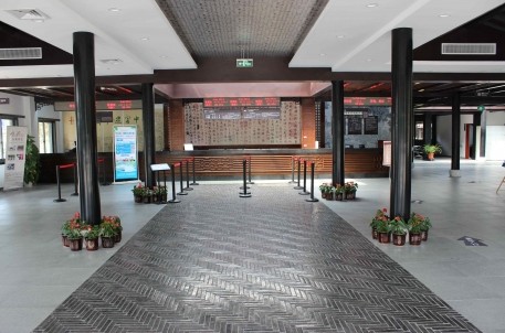 在设计风格和装修理念上,景区游客中心力求体现极强的书法文化和古雅气质。前台背景墙核心部分用的是《兰亭集序》高清写真,左侧悬挂的是五块以“兰亭雅集”为主题的雕刻作品,右侧上墙的则是明代修禊图(局部)。一墙之上,左中右三块区域用木质方格合理区分,又以兰亭相关的书画作为统一牵引,形成独特而又和谐的文化墙体,给予广大游客十分直观的文化渲染力。