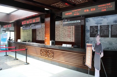 崭新的游客服务中心服务设施全面升级。前台设有:讲解接待、投诉/咨询、售票(散客/团队/演艺/市民免费)、便民服务、绿色通道等专柜,并配合A级旅游景区服务要求,以中/英/日/韩四国语言将窗口服务内容显示于LED显示屏,鲜明立体而又规范有序。与此同时,中心另设有医务室、独立的强/弱电房、影视厅、茶吧等服务区域,精细化内部管理的同时,提升便民为民服务意识。而方便操作的自动售货机、自助行李寄存柜、自助手机充电站、自助饮水机、杂志书报免费取阅、轮椅婴儿车租借等便民措施的全面升级,也赢得了游客广泛称赞。