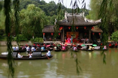 婚庆的船队,驶出宝珠桥不远,缓缓返回至码头,整齐地排列在水乡社戏台下,一场精彩的水上社戏开始了。戏迷朋友们粉墨登场,优美动听的越剧将新人及游客们带进入梦里水乡。