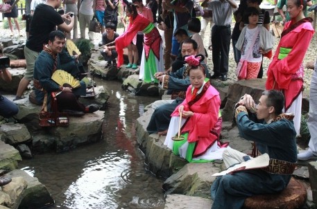 交流活动结束之后,一行人来到曲水流觞,当年王羲之邀好友临流泛觞,饮酒赋诗,今日大师们身着古装,重温经典。挥毫落纸如云烟,笔墨挥洒惊韵味。活动中,大师们纷纷提笔:“石上艺术兰亭叙玉,曲水流觞尽显风流”、“同赴兰亭共举杯,曲水流觞醉不归”,篇篇锦绣,字字珠玑,留下诗句,共叙幽情。