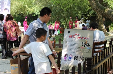 志愿者们身穿“横、竖、撇、捺、点、折、勾”七个笔画造型的人偶服,和前来景区游玩的小朋友们合影、互动。小朋友们只要集合七张与“小精灵”的合影,答对和景区及书法有关的知识题,就可获得抵价券,参与景区曲水流觞、书法描红等特色活动。