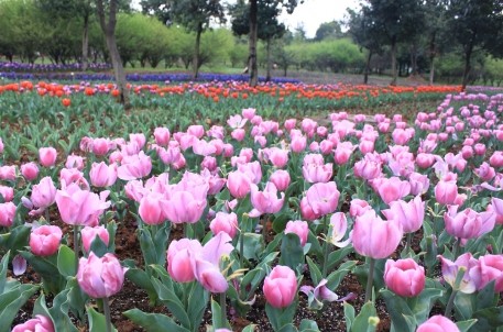 绿树青山依旧繁茂,红梅白梅傲气凌人,梨花初显盛开之势,郁金香也在花卉园内呈现出一片蓄势待发之状。其中尤以班雅、脆皮玛丽、纯金、玛雅、法国之光、迈阿密日落、达尔文橙色、荷兰美人弗拉明戈等品种为主的50款郁金香最为焦点,配之以大西洋、蓝星、粉珍珠、亚美尼亚、蓝蒂为代表的11款风信子及4款洋水仙,并用各色野花点缀其中,勾勒出“行云流水”、“越乡花谷”、“花田喜事”、“印象绍兴”、“大禹疏水”等景观带,远近交融,高低相携。花卉园内春花绿树相间,长廊木亭相配,原来恐龙园内的30余条仿真恐龙情景交融,真实新颖的蝴蝶谷坐落其中,并点缀以风车、木鞋、喜羊羊、“中国梦”等造型小景点,成就一片不一样的花卉天地,打造一座别具一格的会稽山。