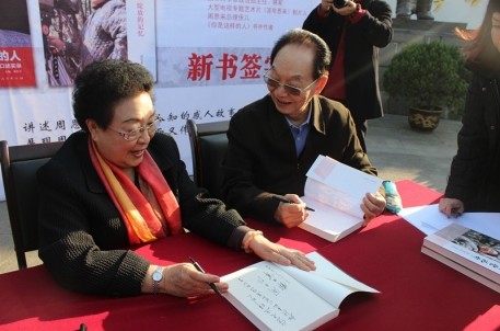 签售活动准时在下午两点半举行,不一会儿,现场就排起了长队。在半个小时里,来自外地的游客、绍兴市民以及学生将主办方准备的150套书抢购一空,满怀期待地等着两位老人的签名。80岁的周尔均和75岁的邓在军签名非常认真,他们细心的询问读者的情况,为其写上例如“努力学习,精益求精”等激励的话语。在签售的两个多小时里,二老一直面带微笑,字迹工整有力。