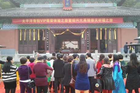 28日清晨,金华地区太平洋寿险VIP尊荣体验之旅暨绍兴大禹陵祭天祈福之旅在大禹陵隆重举行。来自金华地区的参祭人员由神道缓步进入大禹陵,在享殿开始祭禹仪式。7点10分,仪式正式开始,祭禹司仪掌握整个流程,主祭人敬香、敬酒、参拜,参祭人敬香、参拜,前往大禹陵禹庙大殿敬香、参拜,最后来到祭禹广场,敲响平安钟祈福。在景区工作人的协助与引导下,整个仪式在隆重庄严的氛围中有条不紊开展并顺利结束。
