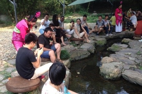 9月14日下午,同程网浙江区总监高元甲率江苏市场的营销员前来景区考察参观。来宾们此行主要是为提升景区休闲体验产品做一个较为全面的市场调研,从而更好的挖掘景区内涵,开发更适宜的旅游活动。 来宾们一行认真聆听景点讲解后,还亲身参与了仿古的曲水流觞活动。他们不仅效仿古人即兴赋诗,还吟诵了古人的经典诗篇,真可谓“古今结合,热闹非凡”啊! 绍兴兰亭景区 徐燕燕