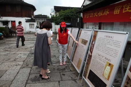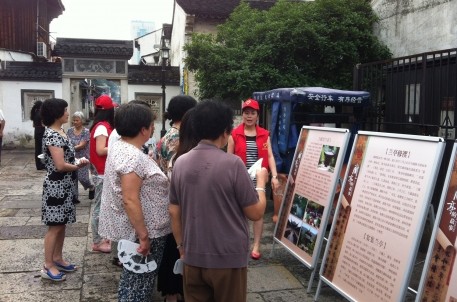 ,是我国第八个文化遗产日,主题为“文化遗产与全面小康”。绍兴博物馆围绕主题,开展“展览进社区”活动。博物馆志愿者继北海社区后,第二次送展览进社区。志愿者们来到位于仓桥直街历史街区的越都社区,悬挂宣传横幅,分发宣传资料,宣传文化遗产的保护与传承,同时把《兰亭的故事》展板送进社区,使社区居民足不出户就更看到博物馆展览。同进,博物馆还邀请社区居民到馆免费观看绍兴历史宣传片—4D电影《越魂》,让居民更加直观的了解绍兴历史文化。